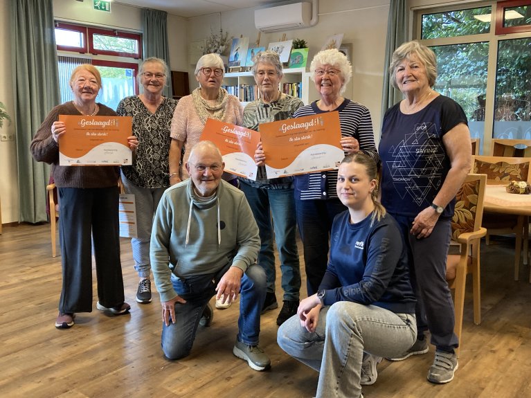 Op de foto: Fysiotherapeut Chimene en de deelnemers van de training in De Loohof in Zetten.